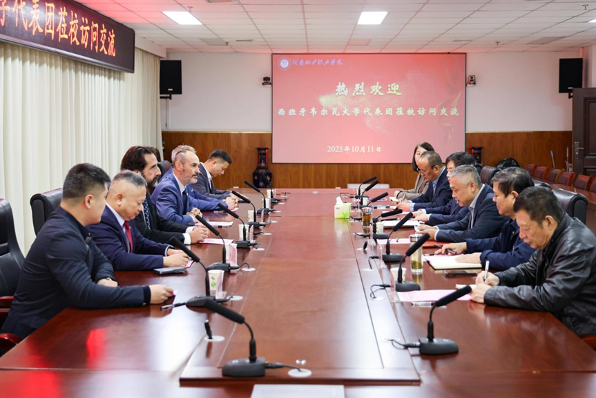 河南地矿职业学院党委书记焦洪涛对西班牙韦尔瓦大学代表团一行的到来表示欢迎,他指出,河南省是中华文明之源,郑州作为国家中心城市,既承载千年商都底蕴,又迸发中部崛起活力;而河南地矿职业学院七十年来扎根中原,始终以“明德 精业 勤奋 创新”为校训,为地矿领域发展贡献力量。焦洪涛在欢迎辞中,从地域文化、城市活力延伸至学校办学初心,同时回顾了中西两国从古代丝绸之路到“一带一路”倡议下的千年友谊,表示教育合作是两国深化协同发展的重要纽带。